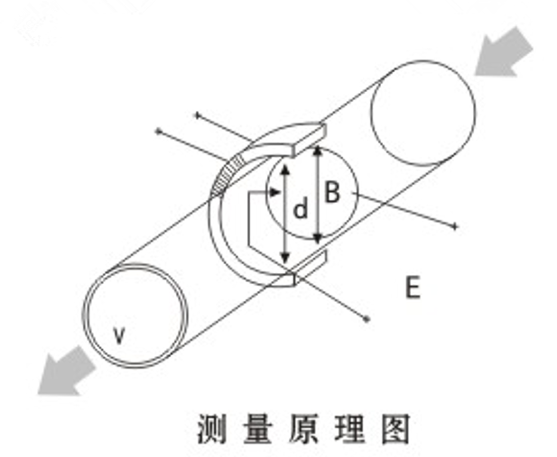 測量流量時,導(dǎo)電性液體以流速V流過垂直干流動方向的磁場,導(dǎo)電性液體的流動感應(yīng)出一個與平均流速成正比的電壓,其感應(yīng)電壓信號通過與液體直接接觸的電極檢出。對于同一流量計S. B. d為常量,所以流量與感應(yīng)電動勢E(或流速V)的大小成正比。