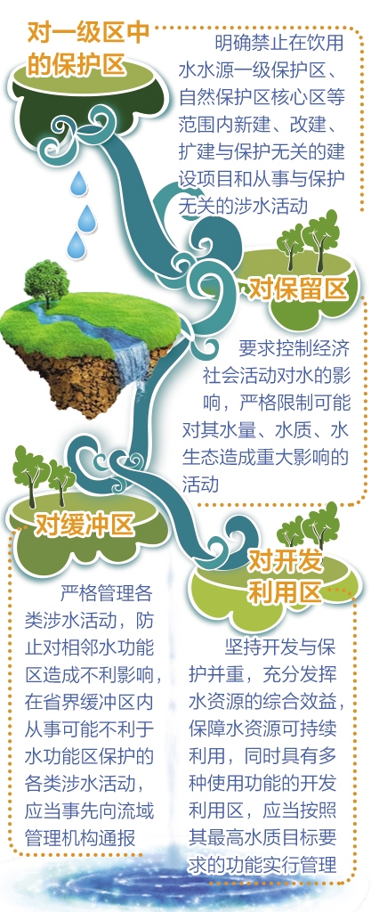 石秋池說,目前我國的水功能區分為一級區和二級區。一級水功能區宏觀上解決水資源開發利用與保護的問題,主要協調地區間用水關系,長遠考慮可持續發展的需求,包括保護區、保留區、緩沖區和開發利用區。二級水功能區對一級水功能區中的開發利用區進行劃分,主要協調用水部門之間的關系,包括飲用水源區、工業用水區、農業用水區、漁業用水區、景觀娛樂用水區、過渡區和排污控制區。